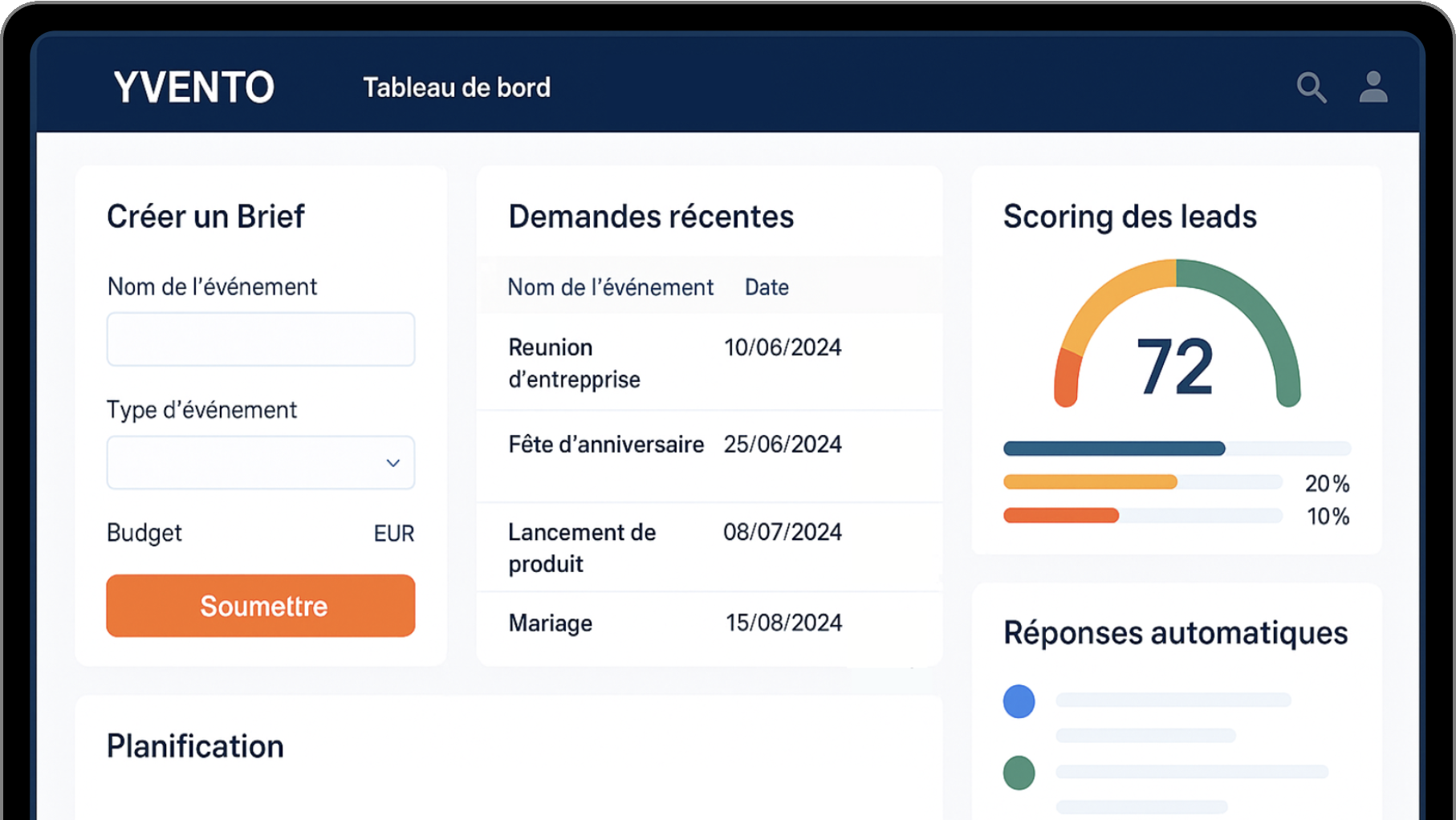 Que vous prépariez un séminaire, un mariage ou un lancement de produit, YVENTO simplifie votre organisation.
